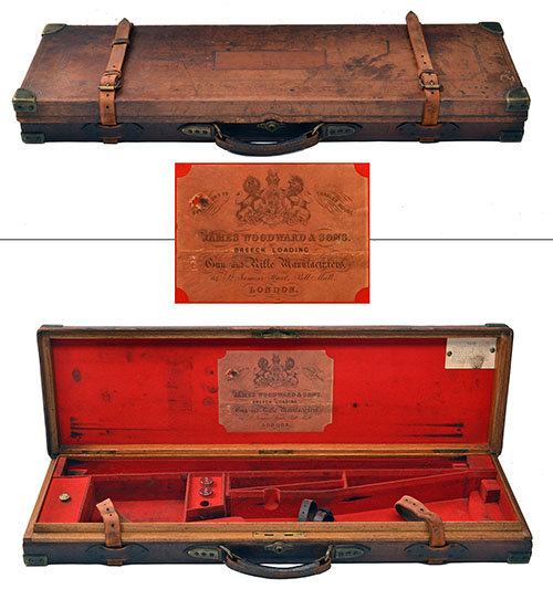 fitted for 29in. barrels, the interior lined with red baize, a James Woodward & Sons trade label, central brass push-button lock (key missing)