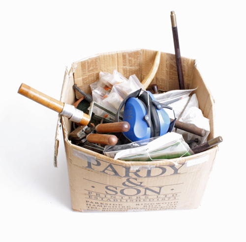 A COLLECTION OF SHOOTING RELATED ITEMS, including bullet moulds, cleaning rod, ear defenders, recoil pads, brass fishing reel etc...