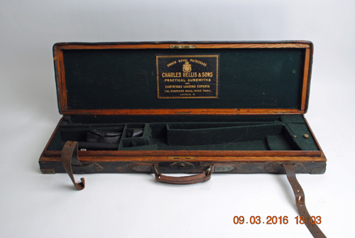 A CHARLES HELLIS & SONS BRASS-CORNERED OAK AND LEATHER SINGLE HAMMER-GUN CASE,