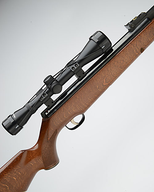 A .22 BARREL-COCKING AIR-RIFLE SIGNED WEBLEY & SCOTT, MODEL 'OMEGA', serial no. 782577, circa 1988, with blued and sighted 19 1/4in. barrel, blued air-chamber, safety catch to rear, beech half-stock and FITTED WITH a Nikko Sterling 'Mountmaster' 4x40 telescopic sight