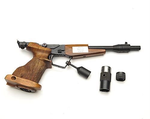 A CASED .177 CO2 POWERED TARGET AIR-PISTOL SIGNED CZ, MODEL 'TAU-7, serial no. 6476, circa 1990, with 10in. barrel, adjustable sights, flip-open breech and anatomical walnut right-hand grip, COMPLETE WITH an abs plastic case and some accessories
