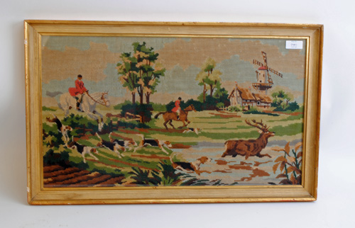 A FRAMED WALL HANGING HUNTING SCENE TAPESTRY, measuring approx. 30in. x 19in.