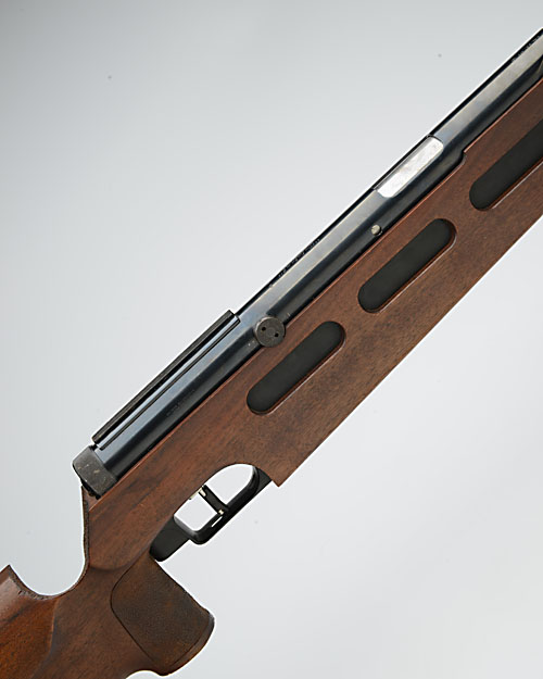 A .177 SIDE-LEVER RECOILLESS MATCH-AIR-RIFLE SIGNED ORIGINAL, MODEL '75', serial no. 024947, dated for 1980, with 18in. barrel, tunnel fore-sight, no rear sight, anatomical walnut stock, action at fault, spares or repair