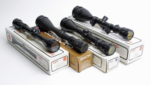 A COLLECTION OF FOUR VARIOUS TELESCOPIC SIGHTS, including Simmons 35.-10x50 Whitetail sight, Edgar Brothers 3-9x50 telescopic sight, 3-9x40 telescopic sight, 3-9x50 telescopic sight