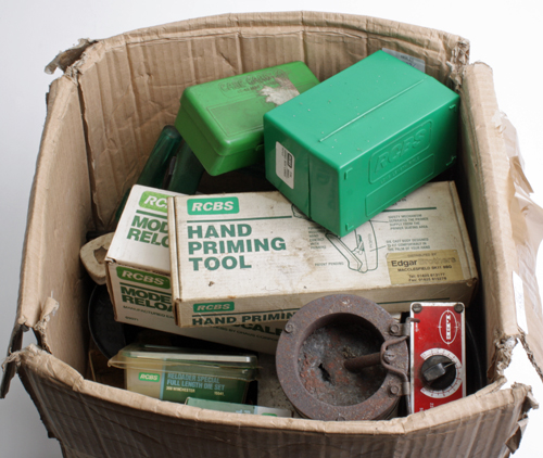 A COLLECTION OF CARTRIDGE RELOADING TOOLS, including RCBS loading press, cartridge trimmer, .243 reloading dies, LEE infinite lead heat control, Lyman .303 reloading dies, funnel, RCBS 5.0.5 reloading scales, RCBS powder trickler, RCBS hand primer tool, RCBS .308 Win reloading dies, RCBS cartridge boxes