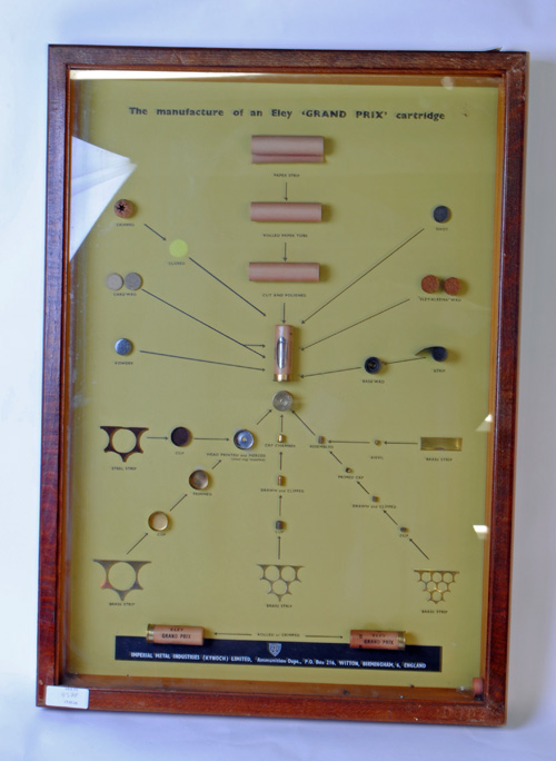 AN ELEY KYNOCH GLAZED CARTRIDGE BOARD, showing the stages in the manufacture of an Eley 'Grand Prix' cartridge, each wood frame measuring 20in. x 27 3.4in.
