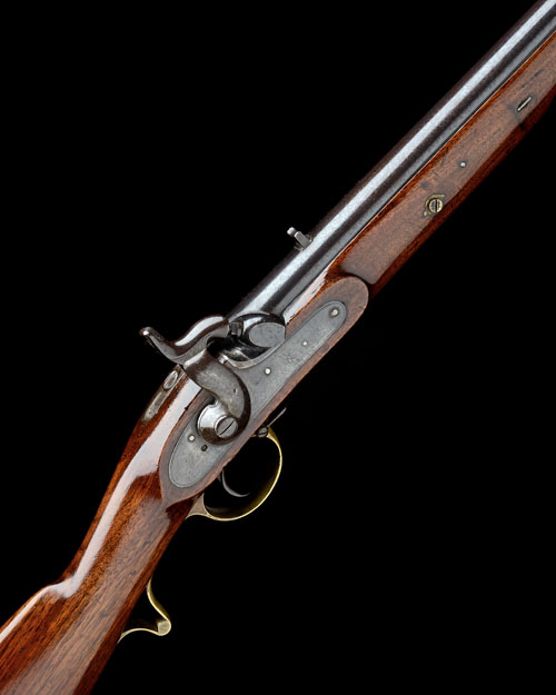 circa 1847, with 20in. sighted barrel, border line engraved lock, walnut full stock, brass furniture including 'Victoria carbine' style trigger-guard tang, side mounted iron saddle-bar and captive iron stirrup ramrod