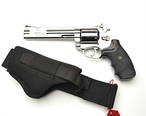 A .357 (MAG) TWO-SHOT HUMANE DISPATCH REVOLVER SIGNED ROSSI, serial no. F095922 recent, with stainless heavy 6in. barrel, unfluted swing-out cylinder with four blanked-off chambers for the UK market, stainless frame and soft rubber chequered grip, complete with a cordura nylon holster