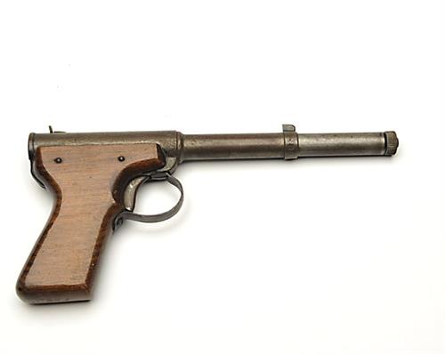 A .177 PLUNGE-COCKING AIR-PISTOL SIGNED DIANA, MODEL '2', no visible serial number, dated for January 1962, with 6in. pop-out barrel, blued receiver and smooth wood grip, worn