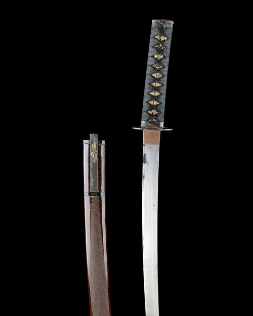 the blade possibly 17th century and 17 1/2in. in length, visible hamon (some tarnish, mild pitting and re-polishing to edge), early style iron tsuba and mounts, some gilded detail and gilded floral menuki under the binding, complete with its mottled brown laquered saya in imitation of wood and a matching 'kozuka'