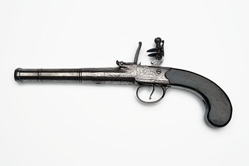 circa 1775, with frozen turn-off 5in. barrel, squared boxlock central hammer action with 'MORTIMER' and 'LONDON' signed in script, slab-sided walnut butt with hallmarked oval silver escutcheon also engraved with an armorial of a goats head above a wreath, sliding trigger-guard bow safety, the whole worn with some loss to detail
