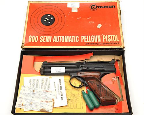 A SCARCE BOXED .22 CO2-POWERED REPEATING AIR-PISTOL SIGNED CROSMAN, MODEL '600 SEMI-AUTOMATIC', serial no. 850512, circa 1960, with 5in. rifled barrel, adjustable sight, black enamelled die-cast barrel housing and receiver signed 'CROSMAN ARMS COMPANY, INC. FAIRPORT N. Y.' over 'PAT. PENDING' on the rear left hand side, and 'CROSMAN 600 SEMI-AUTOMATIC' in raised letters on the right, die-cast trigger and mottled brown chequered plastic grips TOGETHER WITH its original card carton with printed card insert (torn, pistol with some minor discolouration to finish), box lid with scuffed edges) valve assembly converted to sparklett cylinders (untested)