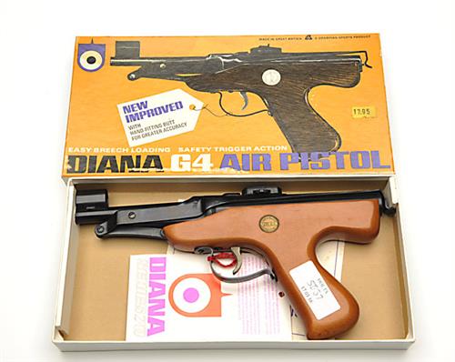 A BOXED .177 LEVER-COCKING AIR-PISTOL SIGNED DIANA, MODEL 'G4', no visible serial number, circa 1979, with blued 4 1/2in. barrel, blued receiver and beech stock, in its maker's carton with swing-ticket and spares list, appearing unfired