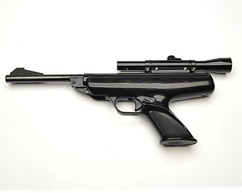 A .177 BREAK-BARREL AIR-PISTOL SIGNED BSA, MODEL SCORPION, serial no. PA 6588, circa 1974, second varient, with blued 8in. barrel, ramp fore-sight (rear-sight removed and missing), blued air-chamber and black plastic chequered stock, fitted with a period BSA 1.5x15 telescopic pistol sight