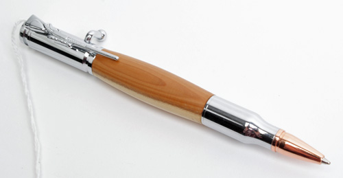 † PSI HAND MADE 'BOLT-ACTION' SHOOTER'S BIRO, recent, with a polished cherry-wood body, the pen barrel formed from a plated cartridge case with a full metal jacket nib, the mechanism operating on a locking bolt and complete with pocket hook formed as a sporting rifle, appearing unused, in a flock pouch