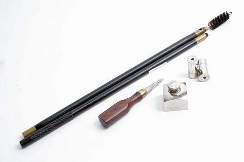 A COLLECTION OF GUNCASE ACCESSORIES, including a J. Purdey & Sons nickel-plated oil bottle, a pair of Pendleton Royal 12-bore snap-caps, medium turn-screw, brass & ebony two piece cleaning rod