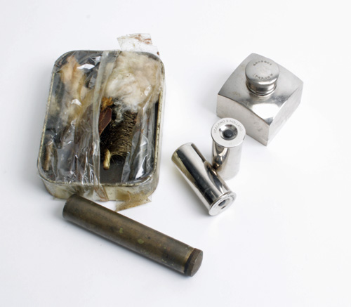 A COLLECTION OF GUNCASE ACCESSORIES, including Boss & Co. nickel-plated oil bottle, a pair of Holland & Holland 12-bore snap-caps, clean cleaning accessories