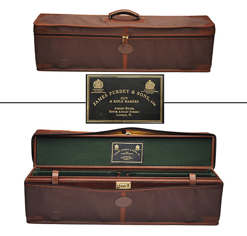 fitted for 32in. barrels, the interior lined with green baize, a James Purdey & Sons trade label, brass combination lock, maroon canvas and leather outer