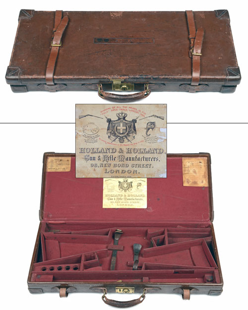28in. nitro barrels, the interior lined with red baize, a Holland & Holland trade label, brass lock (key missing), the lid exterior with 'A.C.H.S.'