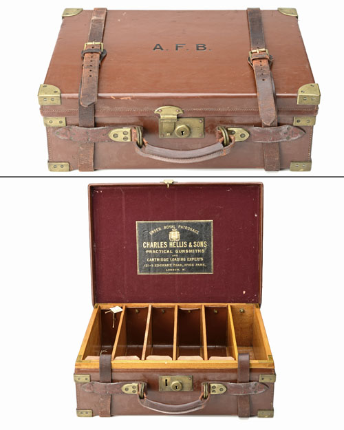for approx. 400 cartridges, the interior lid lined with maroon baize, a leather gold-tooled Charles Hellis & Sons trade label, five oak dividers, six leather lifters (one missing), brass lock (key missing), the lid exterior with the monogram 'A.F.B.'