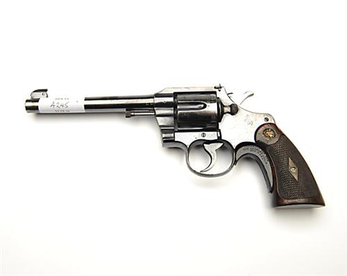 A .38 (SPL) SIX-SHOT REVOLVER SIGNED COLT, MODEL 'OFFICER'S', serial no. 369348, for 1914, with 6in. sighted barrel, fluted swing-out cylinder and solid frame with chequered walnut grips and a 'Pachmayr' grip-filler