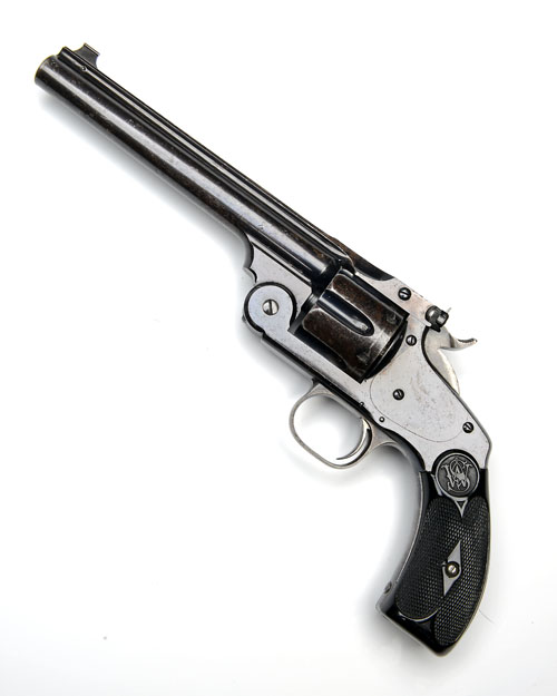 circa 1890, with blued 6 1/2in. barrel, raised sighting rib, blade fore-sight, rear-sight with drift adjustable notched blade, blued break-open frame with auto-ejecting fluted cylinder, black hard-rubber chequered grips embossed with the 'S&W' trademark, colour hardened hammer and trigger-guard, strong amount of colour and finish remaining