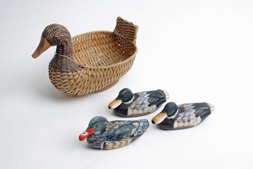A COLLECTION OF WOODEN HAND-CARVED MINI DECOY DUCKS, including a woven duck basket