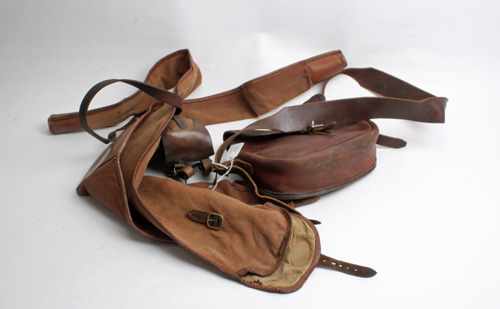 A SMALL COLLECTION OF SHOOTING RELATED ITEMS, including, 2 x brady typer canvas and leather single gunslips, a leather cartridge bag, vintage leather pouch