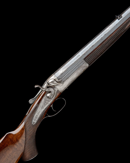 converted from .290 rook, 26in. nitro reproved octagonal barrel with matt top-flat, open sights and one folding leaf sight with white metal inlaid sight lines and marked for 50 and 100 yards, the right side of the barrel engraved 'HOLLAND & HOLLAND. 98. NEW BOND ST. LONDON.' and (overstamped) '.360 SEMI SMOOTH BORE', the left side with 'WINNERS OF ALL THE 'FIELD' RIFLE TRIALS. 1883.', action incorporating John Thomas patent snap-action, patent no. 3091 of 15th November 1871, rebounding back action lock with carved percussion fence, border and acanthus scroll engraving, 15in. pistolgrip stock including steel buttplate, with steel pistolgrip-cap, cheekpiece, weight 5lb. 8oz., in a leather case with Holland & Holland trade label