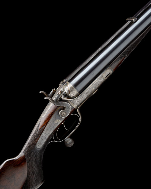 Other Notes: The rifle comes with an additional pair of 10-bore (3 1/4in.) nitro shot barrels by Aug. Lebeau (Fabt. a Liege). The barrels are 30 3/4in. (78cm) with a tapered raised matt rib, 3 1/4in. chambers, bored approx. 3/4 and full choke, with individual 10in. fore-end with Anson push rod release.