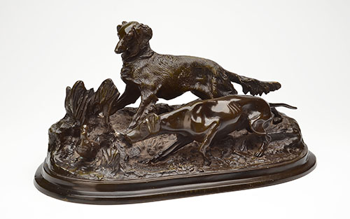 showing a pointer, a setter and a duck in the undergrowth, type listed as D20, page 206 in 'Bronze In Animals' by Christopher Payne
