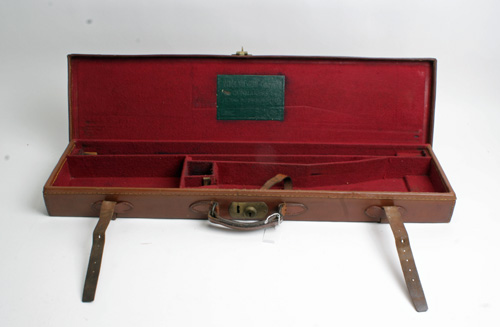 A MIDLAND GUN Co. LEATHER SINGLE GUNCASE, fitted for 30in. barrels, the interior lined with red baize, a Midland Gun Co. trade label, brass lock (key missing),