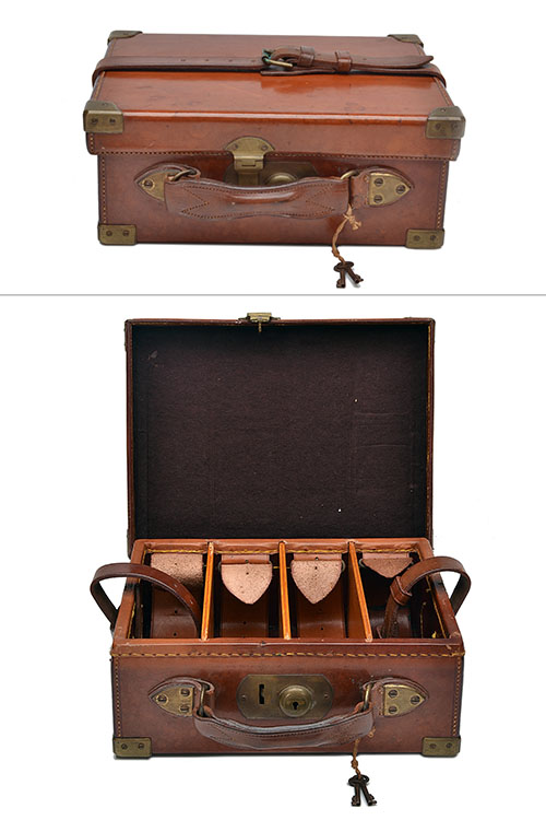fitted for approx. 200 cartridges, the interior lined with brown baize, three oak removable dividers, four leather lifters, brass lock (including keys)