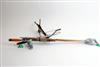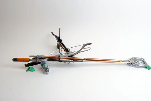 A COLLECTION OF SPORTING RELATED ITEMS, including 2 x salmon fishing gaffs, 2 x 9mm parabellum pistol magazine, crossbow, shooting stick