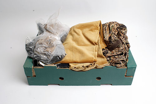 A COLLECTION OF SHOOTING RELATED CLOTHING, including corduroy trousers, camouflage clothing