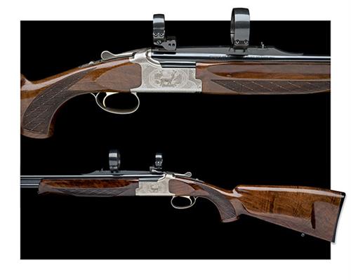 22 1/8in. nitro barrels with sight rib, open sights and ramp-mounted high-visibility bead fore-sight, hold-open toplever, manual safety with integral barrel selector switch, gold-washed single trigger, scroll engraving with game scenes of stag, roe and boar, bright finish, 14 3/4in. hogsback stock with sculpted cheekpiece, sling eyes, Browning buttplate, weight 9lb. 13oz.