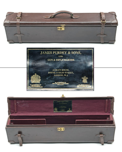 fitted for 28in. barrels, the interior re-lined with maroon baize (butt-end leather flaps missing), a James Purdey & Sons trade label, brass lock (key missing)
