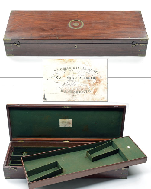 the top tier fitted for two stocks, the bottom tier fitted for four sets of 31in. barrels, the interior lined with green baize, a Thomas Williamson trade label, central brass lock (including key), two brass clasps, the lid exterior with a brass flush-fitting carry handle