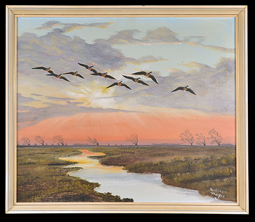 showing barnacle geese in flight at sunset, signed by the artist and dated 1973, measuring approx. 26in. x 21 3/4in.