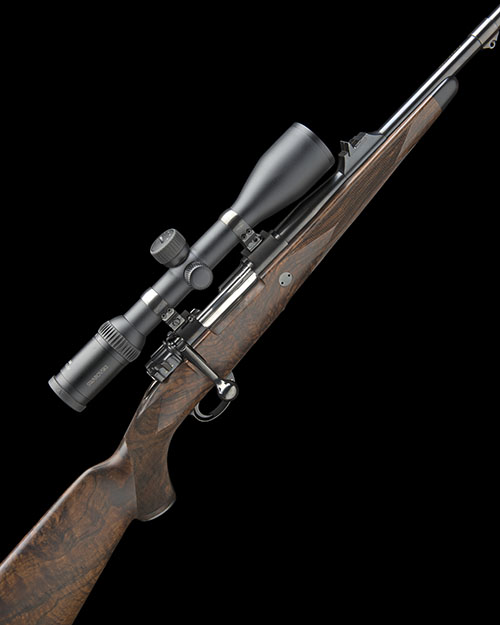 20 3/4in. nitro barrel gold-inlaid with the makers name and calibre designation, block-mounted open sights with folding leaf sight, ramp-mounted bead fore-sight with flip-up moonsight and folding protector hood, the receiver (with thumb cutout) mounted with a Swarovski Z4i 3-12x50 telescopic sight in quickly-detachable mounts, recoil blocks, hinged straddle floorplate with push button release, highly-figured pistolgrip stock with cheekpiece, steel pistolgrip-cap, sling eyes, 14 1/2in. pull including 1in. rubber recoil pad, weight 7lb. 14oz. (unscoped) and 9lb. 4oz. (with scope)