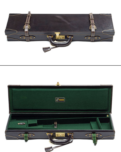fitted for 28in. barrels, the interior lined with green baize, Artesania F. Exposito trade label, brass lock (including key)