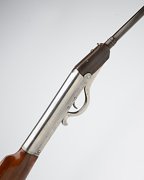 A .25 BREAK-BARREL AIR-RIFLE, UNSIGNED, MODEL 'GEM', serial no. 81281, circa 1900, with two-stage sighted 22in. barrel marked 'MANUFACTURED IN GERMANY' along with crossed rifles trade mark, polished air-chamber in imitation of nickel plate, walnut butt-stock with crescent heel-plate and cocking link forming the trigger-guard