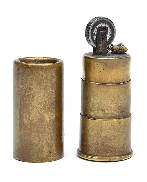in the form of an all-brass 16-bore shotgun cartridge and showing the maker's mark on the headstamp, brass cap to body (some losses showing) which removes to reveal the 'wind-proof' lighter