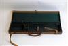 A CANVAS AND LEATHER SINGLE GUNCASE, suitable for 28in. barrels, lined with green baize, central brass lock (key missing).