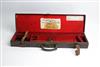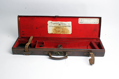 A LEATHER SINGLE GUNCASE, fitted for 28in, barrels, the interior lined with red baize, brass lock (key missing)