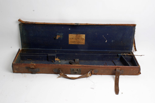 AN AGNEW& SON CANVAS AND LEATHER SINGLE GUNCASE, fitted for 30in. barrels, the interior lined with blue baize, a Agnew & Son trade label, distressed