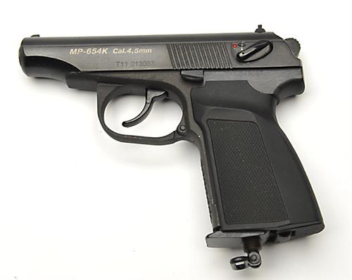 A BOXED .177 (BB) CO2-POWERED AIR-PISTOL SIGNED BAIKAL, MODEL 'MP-654K', serial no. T11 013067, in imitation of a Makarov pistol, in its makers carton appearing little used