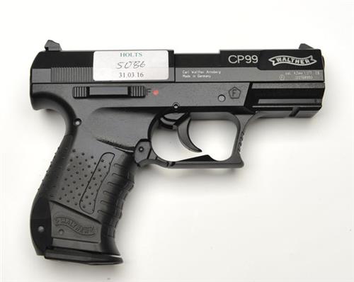 A CASED .177 CO2-POWERED AIR-PISTOL SIGNED WALTHER, MODEL 'CP99', serial no. J22768993, with 3 1/2in. barrel, black finished slide and frame, rotary magazine (three included), replacement spare back-strap, fitted with a Brocock re-fillable air canister, in its makers abs plastic case with instructions