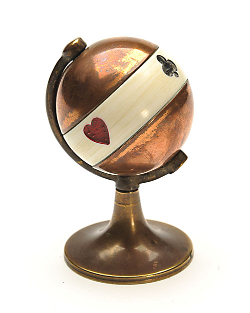 A BRIDGE MARKER, in the form of a globe, in copper and ivorine with a brass mount