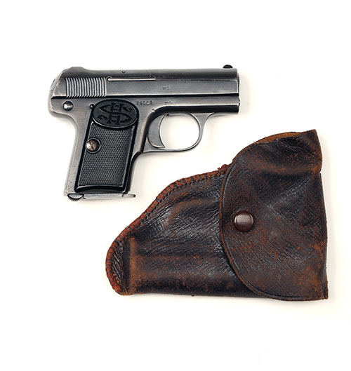 ** A .6.35MM (.25ACP) SEMI-AUTOMATIC POCKET- PISTOL,SIGNED HAENEL serial no. 24062 (SCHMEISSERS PATENT) with 2in barrel, blued slide grooved for sighting and frame (older refinish) and black plastic factory grips together with a vintage pocket leather holster the flap top with press stud fastener .
